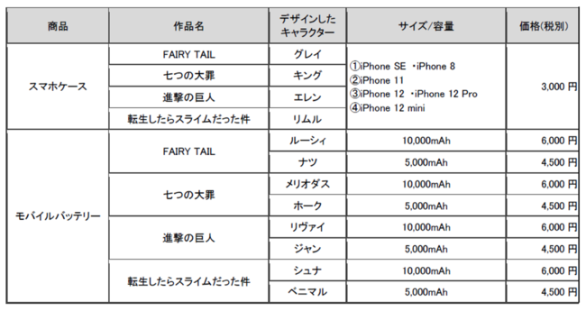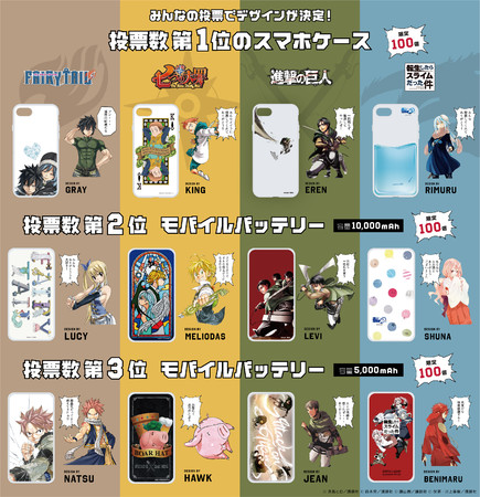 『FAIRY TAIL』 『七つの大罪』 『進撃の巨人』 『転生したらスライムだった件』ファンの皆さまの愛にお応えし、2位、3位のデザインを使ったモバイルバッテリーも発売