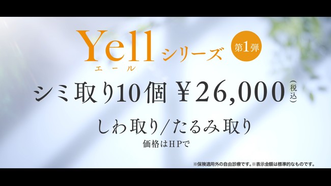 テレビCMでは、怖い、痛い、高い、という美容医療の時代が終わったことを訴え、ミドル世代の美を医療面でサポートする取り組みをアピールします。相川代表が「美容医療というと身近に感じられない方がすごく多いと思う」と、Yellシリーズを立ち上げた背景を述べ「今は注射1本でたるみやシワをなくすことができたり、レーザーを使ってシミを取ることができるようになっています」と怖さや痛みを伴わない今の施術を紹介しています。