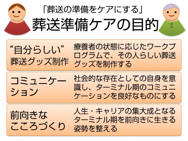 一般社団法人知識環境研究会は、終末期のこころのケアとして、生前から療養者自身が取り組む「葬送準備」に着目しました。ターミナルケアの専門家と葬送の専門家らの協力を得て研究を進めた結果、療養者と共に実践できる各種のアクティビティを通じて「葬送の準備をケアにする」という新しいケア手法を開発しました。「自分らしい」葬送グッズの制作や入棺体験などのワークを行うことにより、療養者とケアする者の双方にとって、死を前向きに受け入れる効果が期待されます。