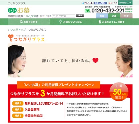 「いいお墓」を通じて資料請求した方で、2015年2月1日から4月30日までに「つながりプラス」のお申込をいただいた場合、入会金と3か月間の月額利用料が無料となります。