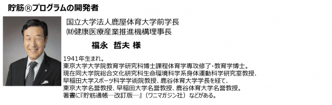健公プロジェクトでは、一般財団法人健康医療産業推進機構(以下、HIP)理事長の福永哲夫氏(鹿屋体育大学前学長)が提唱する、毎日自宅でできる道具のいらないカンタンな「貯筋®プログラム」に基づいた筋力ト レーニングを指導。