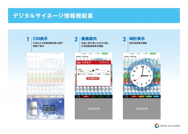 トーン・アップは、デジタルサイネージ「adbo」や、高機能デジタルサイネージを搭載した自動販売機「スマートベンダー」の機器販売、及び広告枠販売を行っています。