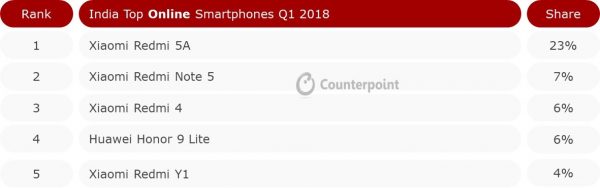 - トップ5機種の中で、Huawei Honor 9 LiteのみがXiaomiの独走態勢に善戦しています