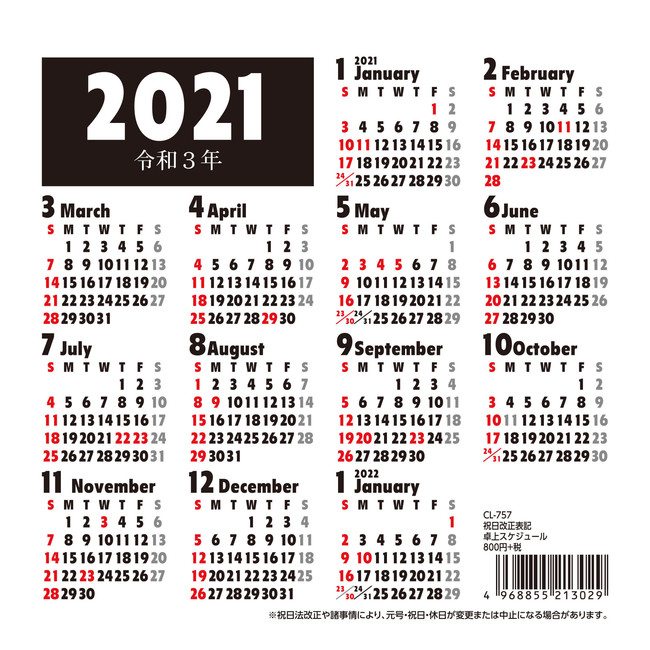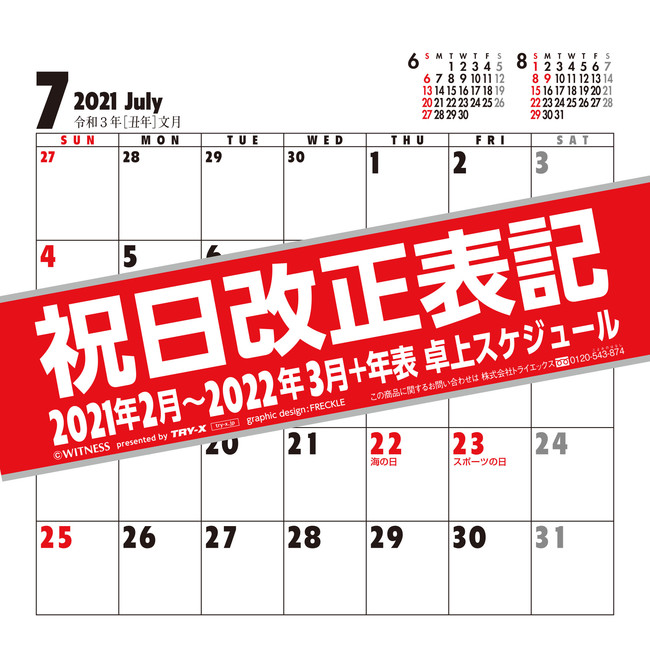 株式会社トライエックス(本社:埼玉県八潮市、代表取締役:沼端宏)は、昨年11月に内閣府により成立した「祝日等に関する特措法」に対応した2021年版『祝日改正表記カレンダー』と『祝日等修正用シール』の発売を決定いたしました。令和3年2月1日発売開始となります。