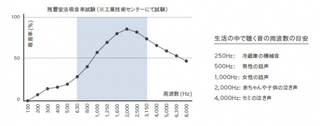 約630Hzから大きく上昇し、1,000Hzの時点で50%、2000Hzで86%と、中音域~高音域に対する吸音効果が高いことが伺えます。