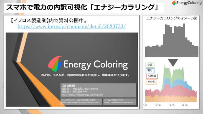 株式会社EnergyColoring(本社:東京都府中市)は、スマートフォンによる消費電力の用途別内訳見える化クラウド「エナジーカラリング」のプレゼン資料を、株式会社イプロス様のご支援の下、公開いたしました。イプロス会員の方は即時ダウンロードが可能です