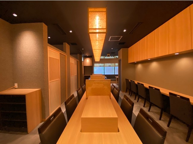 店舗面積は40坪強。これまでの水炊き華味鳥の個室を取り入れつつ、朝食ビュッフェに対応すべく中央にコミュナルテーブルを配し、朝はここがビュッフェ台として機能する。