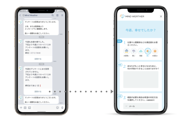 「マインドウェザー」は、LINEで毎週アンケートを配布し、社員のモチベーションを管理するサービスです。社員の離職防止を目的に、シンガポール国立大学出身のヤップ博士との共同開発で、心理学に基づき開発されました。