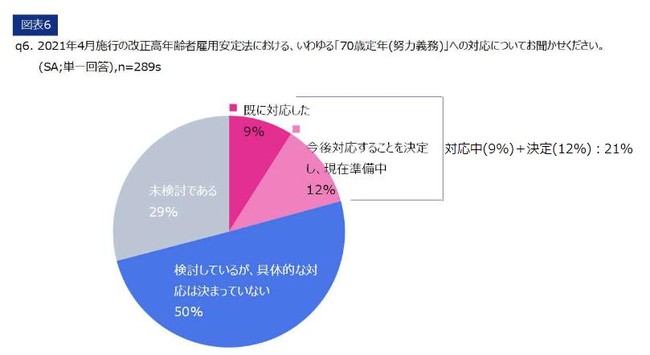 ポイントとして、「70歳までの就業機会確保」について21%対応を決定しており、50%が検討中。65歳までの