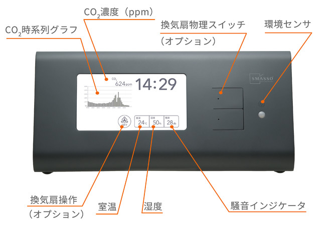 事前に設定されたCO2濃度を超えると警告とともに「CO2濃度が基準値を超えました。換気を行ってください」と音声ガイダンスが流れます。またオプション機能としては、換気扇と連動させることも可能となっており、厚生労働省の指針による 30 分に一度の強制換気に加え、3密状態による二酸化炭素の上昇に応じて自動的に換気扇を作動させ、室内の空気を入れ替えることができます。