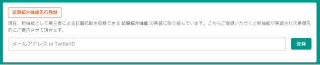 記事紹介機能を手軽な手数料で提供!第三者による記事拡散が期待でき、アカウントの認知度向上や記事の販売数向上が期待できます。こちらご登録いただくと新機能が実装され次第優先的にご案内させて頂きます。