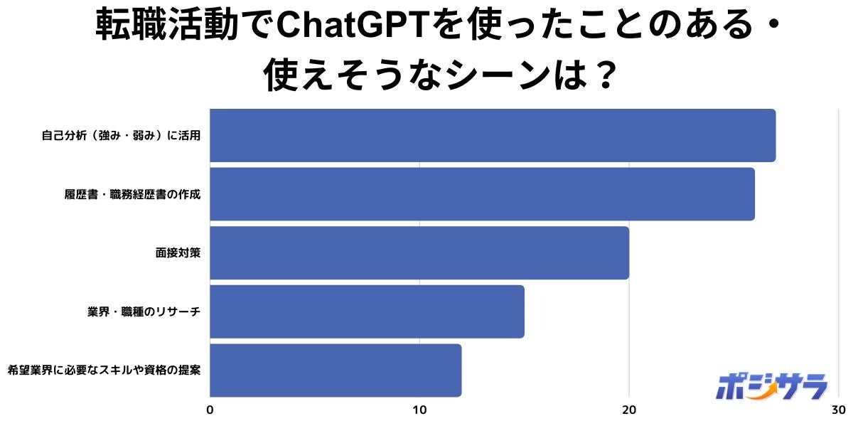 株式会社ACILが運営するキャリア・転職情報メディア『ポジサラ』(https://pojisara.com/)は、全国の20代以上の男女を対象に「転職活動でChatGPTを使ったことのある・使えそうなシーンは?」をテーマとしたアンケート調査を実施致しました。