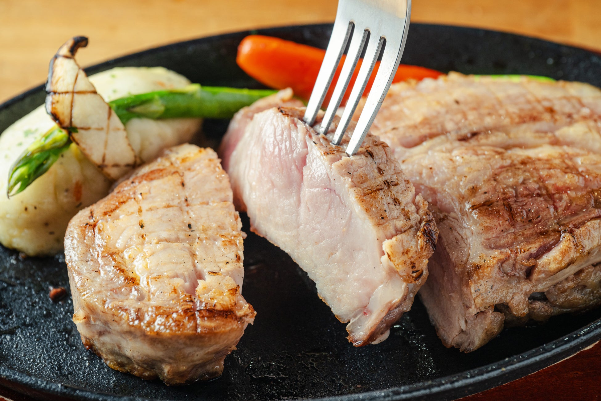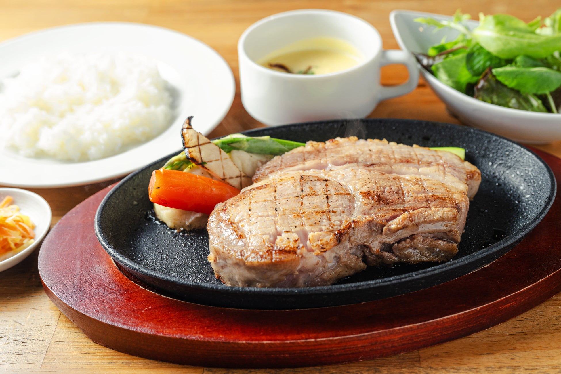 畜産業が盛んな茨城県が威信にかけて開発した銘柄豚「常陸の輝き」。赤身はきめ細かくサシが入りしっとり柔らかく、さらさらとキレの良い脂が魅力的なロース肉を豪快に300g焼き上げました。肉好きにはたまらない、ペロッといただけるボリューム満点&満腹ランチをご堪能ください!!