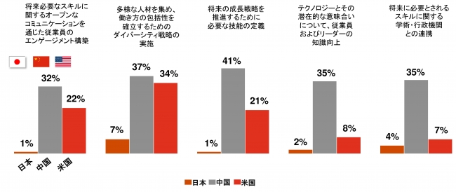 「将来の成長戦略を推進するために必要な技能の定義」については、日本(1%)、中国(41%)、米国(21%)。「テクノロジーとその潜在的な意味合いについて、従業員およびリーダーの知識向上」は、日本(2%)、中国(35%)、米国(8%)となり、日本企業のスキルアップへの取り組みはほとんど進捗していない実態が明らかになりました【図表9】。