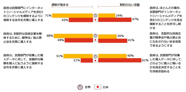 世界全体では3分の2を超えるCEOが、「政府は民間部門にインターネット(ソーシャルメディアを含む)コンテンツを規制するよう強制する法令を次第に導入する」、「政府は支配的な技術企業を解体するために、競争法/独占禁止法を次第に導入する」と考えています。また、半数を超えるCEO(51%)は「政府は民間部門が収集した個人データに対して、金銭的報酬を個人に支払うように強制する法令を次第に導入する」ことも予測しています。