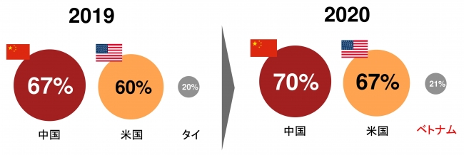 - 自社の成長にとって重要な国は、昨年に引き続き中国が1位、米国は2位、3位はタイに代わりベトナムがランクイン
