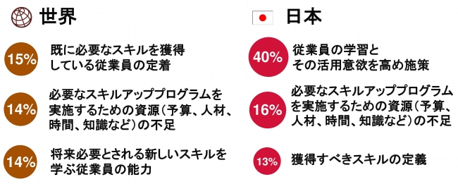 現在のスキルアップの取り組みにおいて直面している重要な課題について質問したところ、日本のCEOは「従業員の学習とその活用意欲を高める施策(40%)」、「必要なスキルアッププログラムを実施するための資源(予算、人材、時間、知識など)の不足(16%)」、「獲得すべきスキルの定義(13%)」と回答しました。世界全体では、「既に必要なスキルを獲得している従業員の定着(15%)」、「必要なスキルアッププログラムを実施するための資源(予算、人材、時間、知識など)の不足(14%)」、「将来必要とされる新しいスキルを学ぶ従業員の能力(14%)」と回答しました【図表10】。