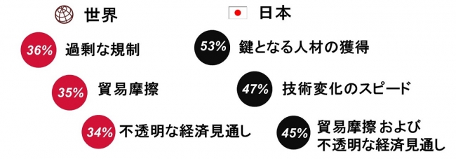 「鍵となる人材の獲得(53%)」、「技術変化のスピード(47%)」、「貿易摩擦(45%)」および「不透明な経済見通し(45%)」は日本のCEOの3大脅威