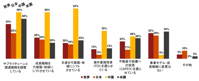 世界全体でも同様に、「サプライチェーンと調達戦略を調整(43%)」、「成長戦略を代替国・地域にシフト(26%)」に加え、「事業モデル・成長戦略に変更はない(32%)」という結果になりました。一方で、中国のCEOは、「サプライチェーンと調達戦略を調整(58%)」、「成長戦略を代替国・地域にシフト(58%)」、「生産を代替国・地域にシフト(63%)」と回答しました。