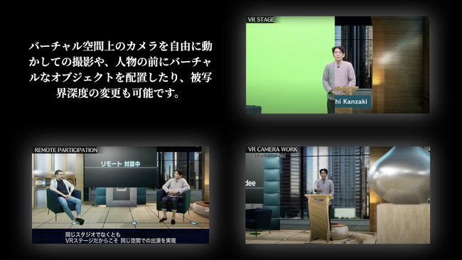 バーチャル空間を利用することのメリットは、スタジオやオフィスなど、収録や配信を行っているその場で、リアルタイムに人物と空間を合成できることです。