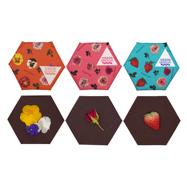 良質なカカオ豆を求め世界中を訪問し、焙煎から製造・販売まで自分たちで行うというこだわりが詰まったウシオチョコラトルのこだわりチョコレートに、Miwakoにより独自開発されたフリーズドライエディブルフラワー(特許出願中)を使用したチョコレートは全6種類。