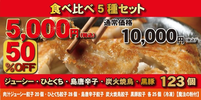 (ジューシー餃子20個・ひとくち餃子28個・島唐辛子餃子25個・炭火焼鳥餃子25個・黒豚餃子25個)