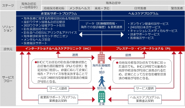 PIが大手海外進出企業を中心に100社以上、30,000人以上の駐在員や帯同家族に提供しているヘルスケアプログラムとの相互補完関係を構築し、駐在員の医療データの連携等を行うことで、赴任前から帰任までの未病・予防対策やメンタルヘルスチェック、並びに日常や緊急医療対応に至るまで、企業の人事部等の担当部署で必要とされるほぼ全てのステージを網羅した対策の構築が可能となります。