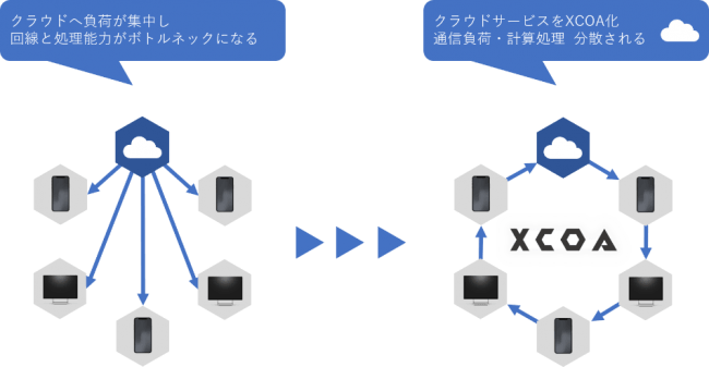 本件のクロスコンピューティングアーキテクチャ(XCOA)はこうした課題を根本的に解決する技術です。クロスコンピューティングとはTRIARTが長年研究を重ねた独自の技術で、様々な機器をP2Pで接続し、機器同士が相互につながることで、自律制御しながらインターネット上に高性能で計算も可能な「超高性能のコンピュータ」を形成します。IoT機器のネットワークそのものがコンピュータになることで、クラウドサーバから全IoT機器に対して集中管理する必要から解放されるだけでなく、端末同士の処理でクラウドサーバ以上の速度で処理をすることに成功しました。