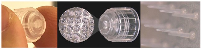 従来のマイクロニードルでは、直径100μm程度の微小な針に貫通孔を形成することは困難でしたが、当社では、特殊なレーザ加工技術を導入して、この貫通孔形成技術の確立に成功しました。貫通孔付き(中空型)のマイクロニードルを使用すれば、投入したい美容液や薬液を、所望の量で経皮投与することが可能になります。すなわち、目的物質自体(例えばヒアルロン酸)を材料とする中実型マイクロニードルに対して、中空型マイクロニードルには目的物質を広く選定できるという特長があります。医療分野では患者数の多い糖尿病患者のインスリン治療、美容分野では美肌効果や育毛促進など、適用範囲が極めて広く、その早期実用化が期待されています。