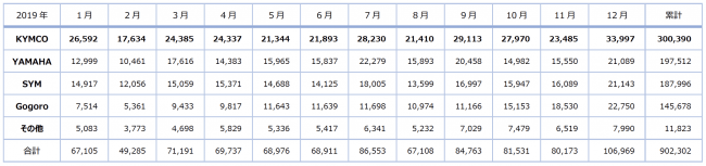 2019年12月の台湾二輪市場は2020年からの政府補助金削減による駆け込み需要などから前月比26,796台増の106,969台と同年最高を記録しましたが、KYMCO(光陽工業)は、33,997台の二輪車を販売し市場シェアの31.8%を占め、一月に30,000台以上を販売した唯一のブランドとなりました。