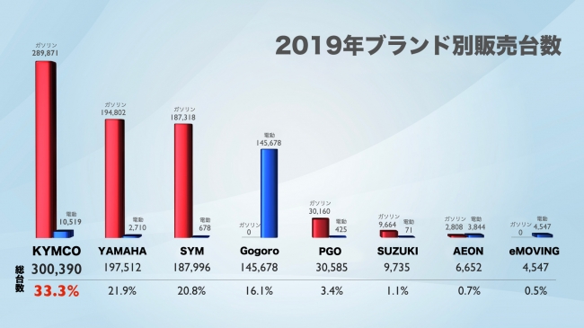 台湾第6期の排出ガス規制を満たしたKYMCOのガソリン車販売台数は289,871台とGogoroを中心とする電動バイク連盟の152,347台に対し1.9倍の市場シェアを有しています。