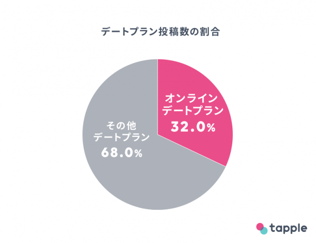 2020年4月1日より、マッチングアプリ「タップル誕生」では外出しづらい状況の方向けて「オンラインデート」を推奨するおでかけプランを公開し、全おでかけプランのうち、約3割が「オンラインデート」のプランが投稿される結果となりました。
