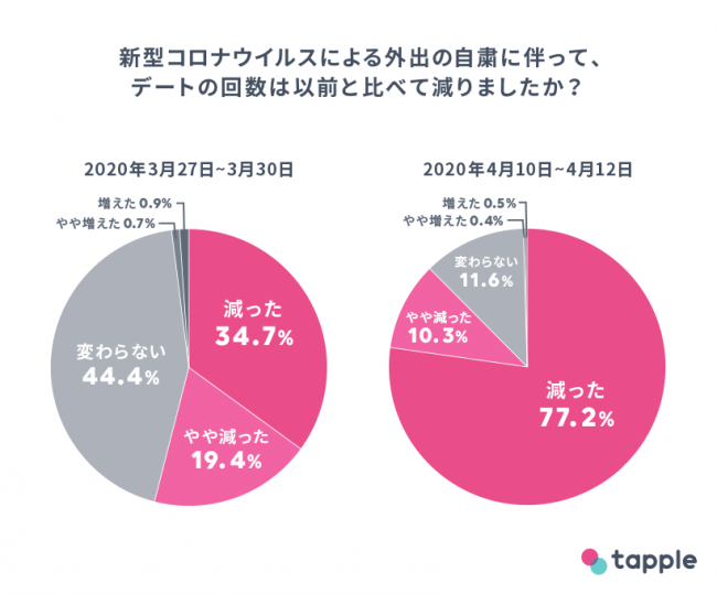 外出自粛に伴って、87.5%の男女が実際に会ってデートをする回数が以前よりも減ったと回答しました。3月時点では約半数がデート自粛傾向にありましたが、4月に入ってより顕著にデートの自粛が見られました。