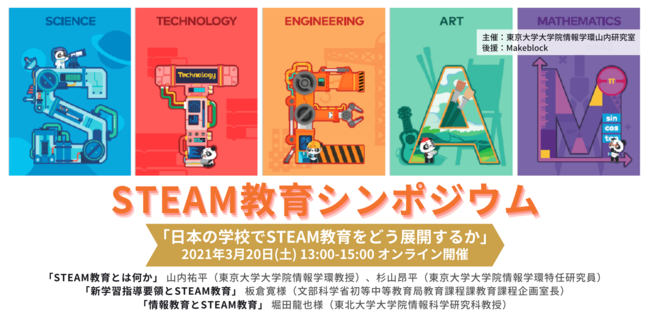 STEAM教育のソリューションを提供するMakeblock Co., Ltd(本社:中国深セン市、創業者CEO:王建軍、以下「Makeblock」)は、2020年4月より東京大学大学院 情報学環 山内研究室が行うSTEAM教育に関する研究(以下「本研究」)を支援しています。この度、本研究の一環として「日本の学校でSTEAM教育をどう切り開くか」と題し、板倉寛様(文部科学省初等中等教育局教育課程課教育課程企画室長)、堀田龍也様(東北大学大学院情報科学研究科教授)をお招きして、3月20日に「STEAM教育シンポジウム」がオンライン開催される運びとなりました。Makeblockは、本シンポジウムの開催を後援という形で支援いたします。