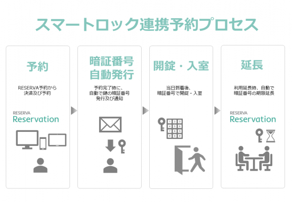 各社のスマートロックをAPIで連携することで、RESERVA上の「施設タイプ」で登録された施設に予約が入ると、利用時間帯のみ有効なスマートロックの暗証番号やQRコードが自動発行・送付されます。また、利用者が施設に実際に入室すると、スマートロックから入室ログが送られ、予約システム上で自動で来店確認及び利用料金のカード決済ができます。
