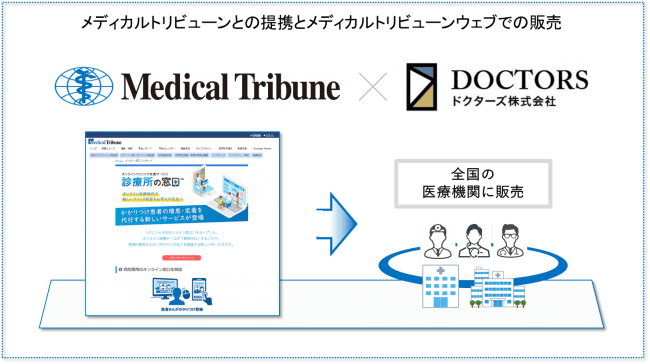 ドクターズ株式会社 (本社:東京都港区、代表取締役社長:柳川貴雄、以下「ドクターズ」)は株式会社メディカルトリビューン(本社:東京都港区、代表取締役社長:丸林哲也、以下「メディカルトリビューン」)と、オンライン診療時代・DX※時代の新しいデジタルヘルスケアサービスの流通・販売を共同で実施するため提携したことを発表いたします。第一弾としてwithコロナにも対応する新たな医療機関業務を支援するサービス「診療所の窓口™」を、メディカルトリビューンが提供する医師会員のための会員登録制ウェブサイト「メディカルトリビューンウェブ」で販売開始したことを発表いたします。また、両社は更なるサービスラインナップ拡張を視野に入れて、強固な協力関係を構築してまいります。