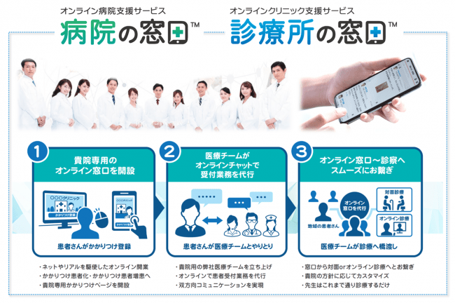 ※「病院の窓口™」は病院(20床以上の病床を有するもの)向けのサービス、「診療所の窓口™」は診療所(病床を有さないもの又は19床以下の病床を有するもの)向けのサービスになります。