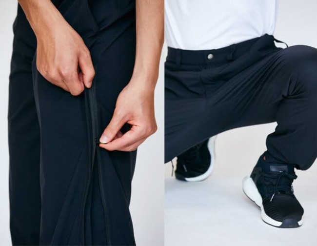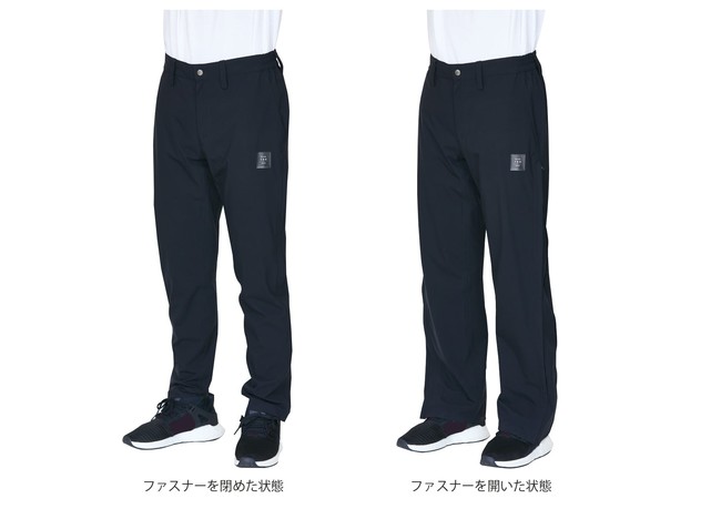 また、パンツモデル「BUKE PT」では、サイドに目立たなく配置されたしなやかなジッパーを閉じることでパンツ幅を絞り、オーバーパンツから晴れの日に単体でも穿ける快適スラックスとしても活用可能。