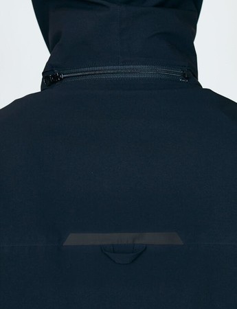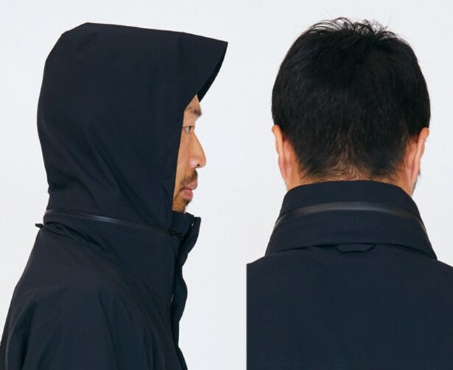 フードは天候やスタイルに合わせて襟の中に出し入れ可能で、フーディ・スタンドカラー両スタイルに対応しています。