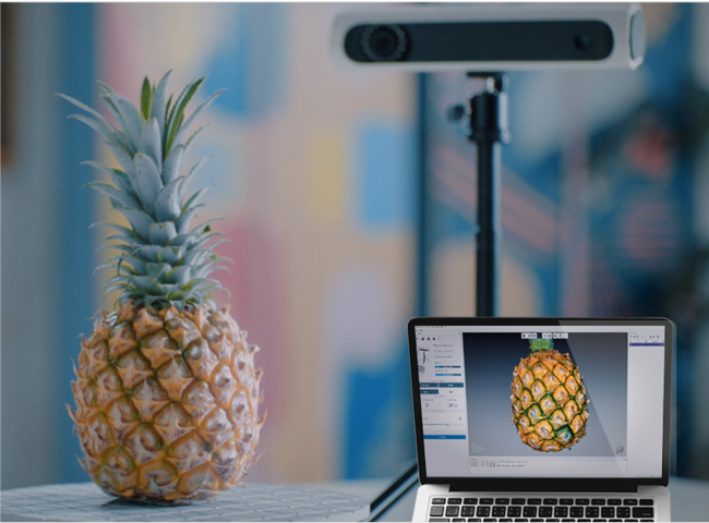 パイナップルのスキャンに使用されるCreality社のCR-Scan 01のプレミアムエディション。CR-Scan 01は、「忠実な色」でオブジェクトをキャプチャすることを可能にしています。