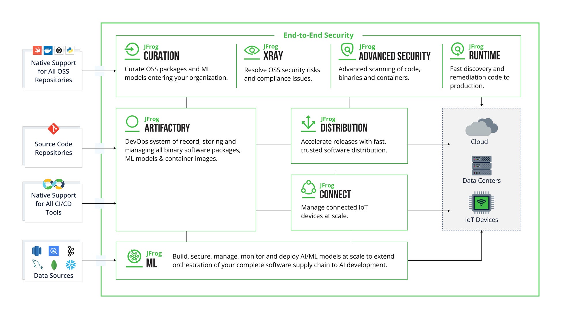 「JFrog Platform」は、グローバルで8,000社以上、Fortune100社のうち89社、日本国内で100社以上のエンタープライズ企業への導入実績があります。金融、IT、自動車、ゲーム領域において、大規模開発、セキュリティガバナンスの中核ツールとして利用されています。「JFrog Platform」は、開発プロセスで使用・生成されるソフトウェアパッケージ、データ、機械学習モデルを一元管理できるプラットフォームです。信頼できる唯一の情報源(Single Source of Truth)としての役割を担い、ソフトウェアリリース全体における高レベルでのセキュリティとコンプライアンスを確保します。「JFrog Platform」の利用によって、企業は開発プロセス全体の改善を促進し、開発速度と品質の向上を実現することが可能です。