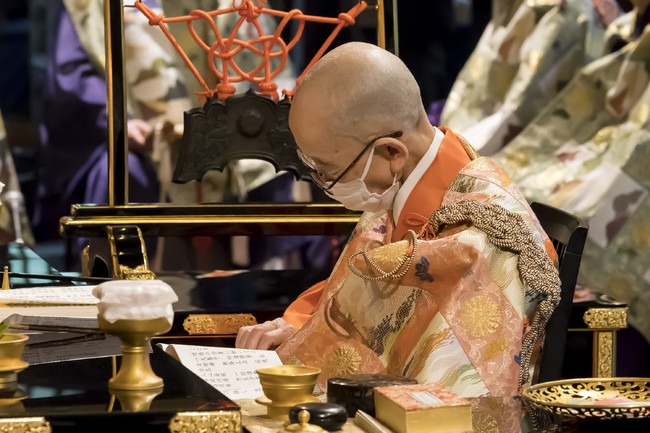 法要の締めくくりには、同委員長のサントリーホールディングス株式会社鳥井信吾代表取締役副会長より映像にてメッセージが奉読され、阿部昌宏天台宗宗務総長は、「二十一世紀は『心の時代』と言われており、一人ひとりが生まれながらに持っているほとけ心(仏性)に目覚め、命の大切さに気づき、他の幸せを願う心が沸き起これば、自他共々に、真に安らかな光りに包まれた社会が実現します」と述べ、同奉行水尾寂芳比叡山延暦寺執行は、「感染拡大を防ぐための行動を自分自身心がけること、そして感染症と闘っておられる患者さん医療関係者の労苦を思い、病気や生活の不安を抱えた人々のことを案じて思いやること、その人のために祈り行動すること、これがいま菩薩としての私たちの使命です。」と挨拶されました。