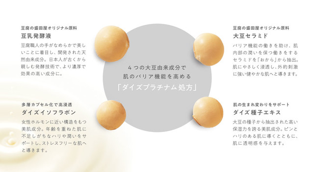 上記豆乳発酵液と大豆セラミドに加え、多層カプセル技術で浸透を高めたダイズイソフラボン(※4)、そしてダイズ種子エキス(※4)を組み合わせた「ダイズプラチナム処方」をシリーズ全品に共通配合しています。