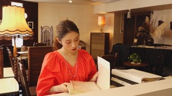 レトロな雰囲気が漂う『名曲喫茶ミニヨン』では、その雰囲気に魅入っており、年季の入った味のあるレコードや家具、全てが手書きであるリストブックといったお店全体の調和感にうっとりしている様子でした。