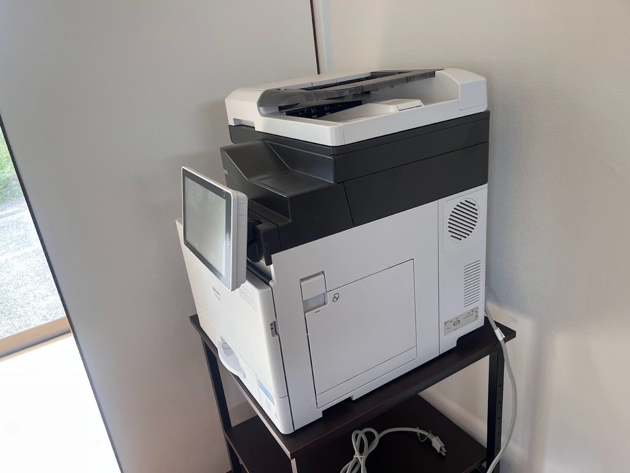 以前から設置していた複合機の設定を再度見直し、10月より各種デバイスとの接続が可能になりました。それを機に、複合機の利用案内と利用票(カラー30円/モノクロ10円)と料金箱を設置しました。