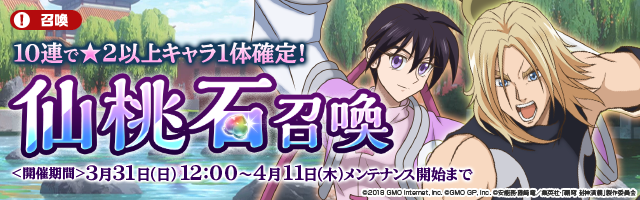 また、これに合わせ、期間限定キャラ「★3 【殷の将軍】聞仲」(CV:前野智昭)と「★3【殷の将軍】朱氏」(CV:名塚佳織)が「仙桃石召喚」に登場します。