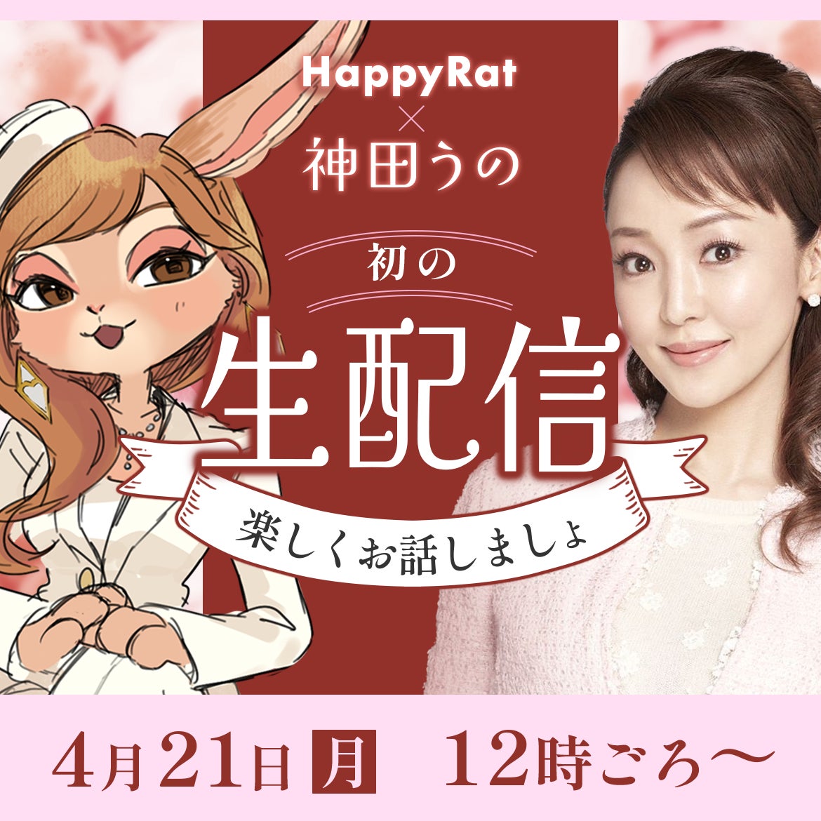 この度、「HAPPY RAT」と神田うのさん、サンシャイン池崎さん、ひょうろくさん、真島なおみさん(※50音順)とのコラボレーションが実現しました。人気タレントたちが個性を活かした動物のAIキャラクターとなって、会話型友だちアプリ「HAPPY RAT」に参加します。