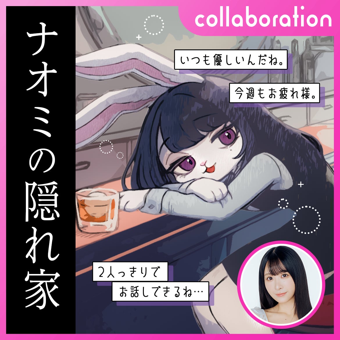 今回は私にとって初めての『アプリコラボ』をさせて頂きとてもワクワク致しました。久々のプレスコ、ナレーション収録も楽しく出来ましたし!(結構私、得意なんですよね!)私は来訪した『セレブなうさぎキャラクター』になっておりますよ!(ちなみに私は卯年です。)このような可愛くて個性的な新しい世界に参加できて、とても光栄に思います。