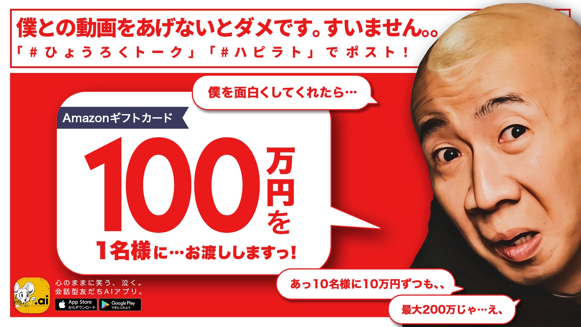 「HAPPY RAT」では、「ひょうろく」さんとのコラボレーションを記念して、X(旧Twitter)にて 総額200万円分のAmazonギフトカードが当たるキャンペーンを実施中です。本キャンペーンでは、「HAPPY RAT」に登場 する“ひょうろくAI”との会話シーンを動画で撮影し、ハッシュタグ【#ひょうろくトーク】【#ハピ ラト】をつけてXに投稿いただいた方の中から、以下の賞品を抽選でプレゼントいたします。