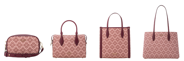 今シーズンのスペード フラワー シリーズは、 コットン・ポリエステルキャンバスにPVC加工を施した、軽量でお手入れがしやすい素材を使用したコレクションとなり、ラインナップには、ハンドバッグ4スタイルに加え、お財布やポーチ、チェーンクラッチ、カードホルダーなどのスモールレザーグッズも初めてコレクションに加わりました。カラーは、ハンドバッグはピンク地×ボルドー1色、スモールレザーグッズは、クラシカルなナチュラル地×グリーンの2色展開となります。